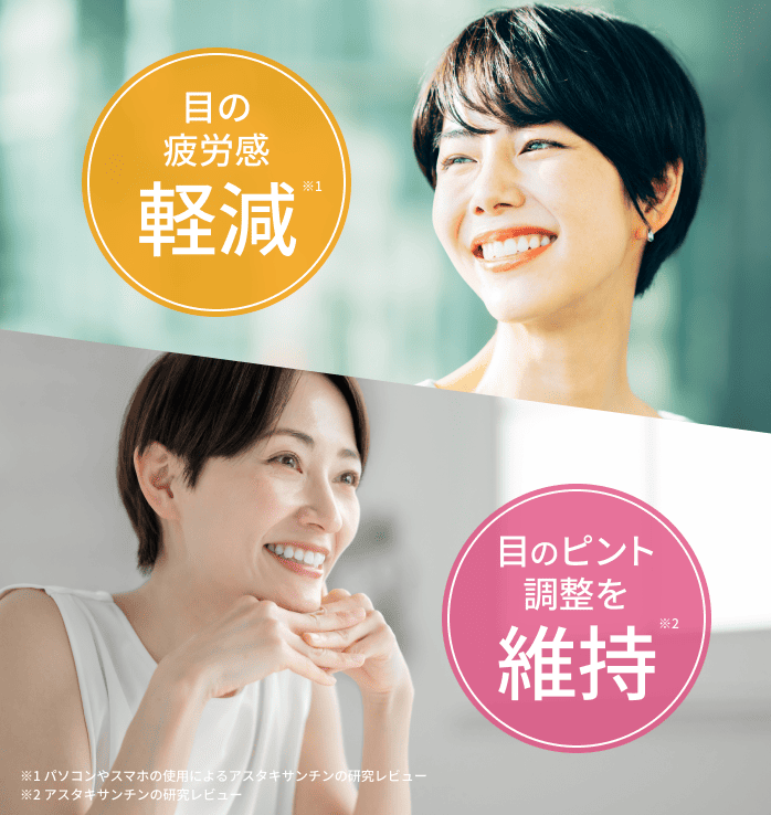 ピント調節機能を維持することで「スマートフォン」や「パソコン」による目の疲労感を軽減することが報告されている成分。