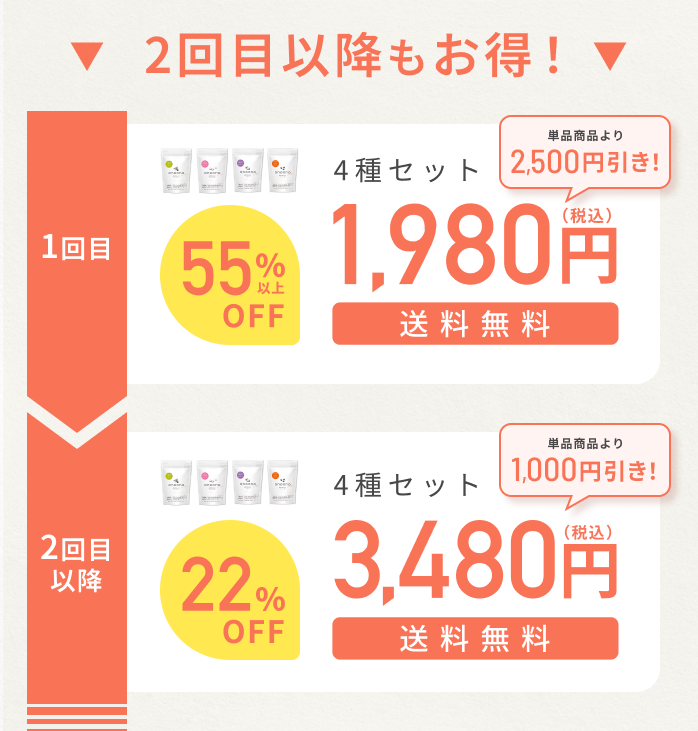 しかも2回目以降も単品価格から約22%Off「3,480円(税込)」送料無料で続けられるから、