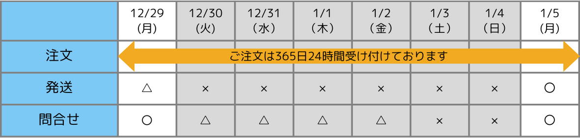 12月29日(月)12時~1月4日(日)のご注文は1月5日(月)以降順次発送